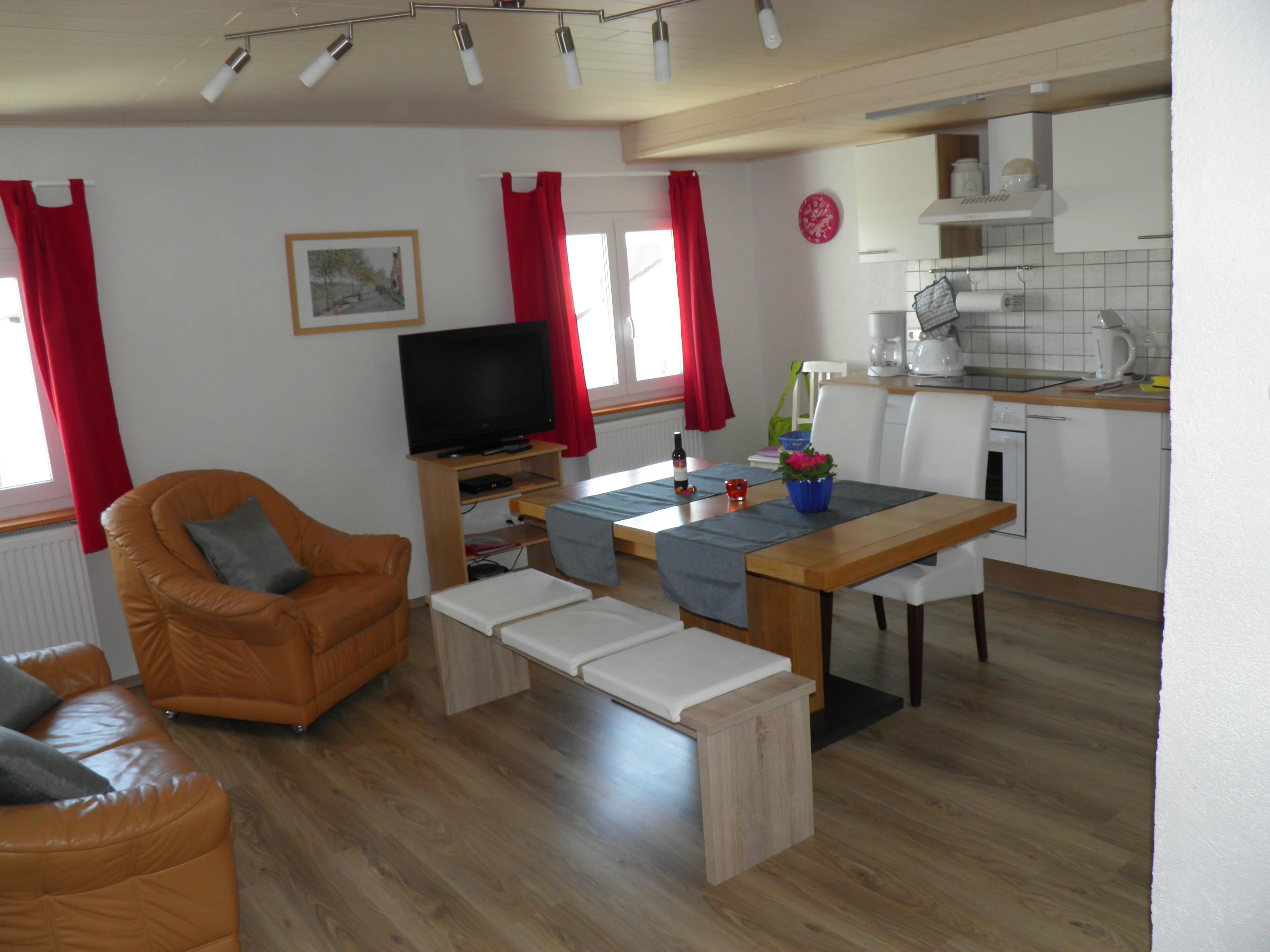 Dort steht Ihnen eine bequeme Couch, ein Esstisch mit vier Stühlen und ein großer Flachbildfernseher (43 Zoll Sat-TV) zur Verfügung.