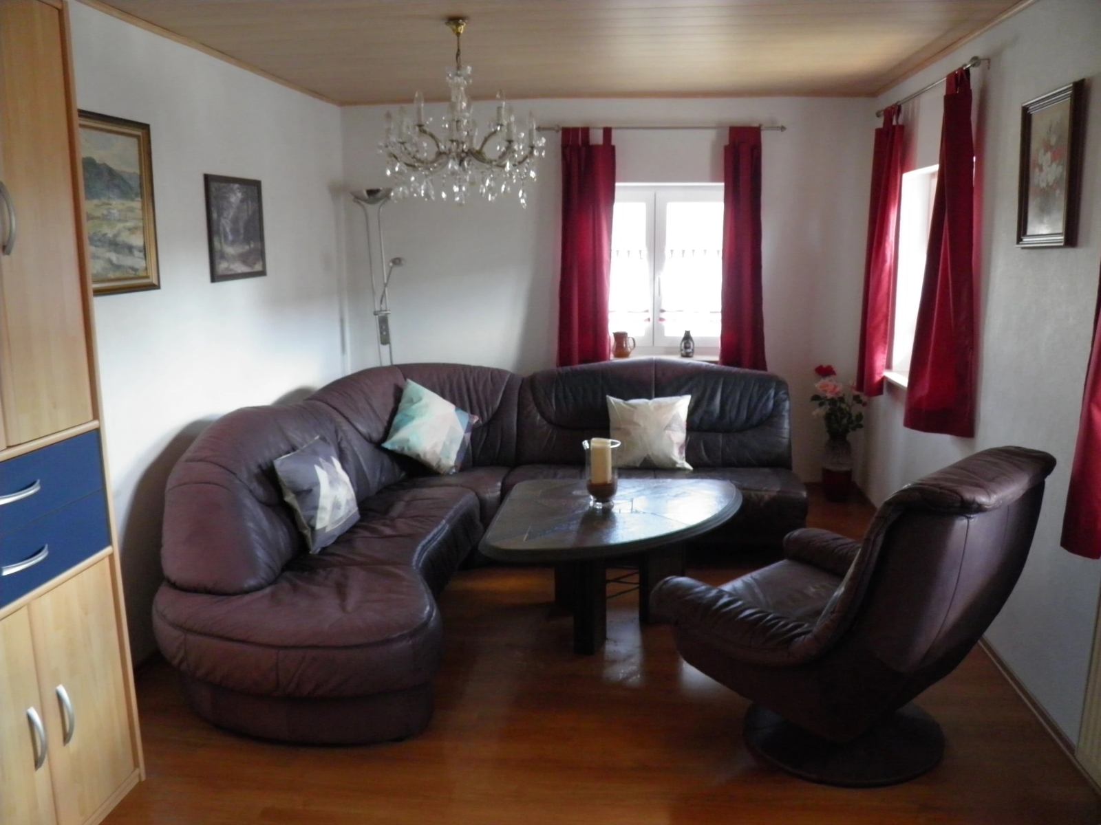 Im Wohnzimmer können Sie es sich auf der großen Couch bequem machen. Dort steht ein Flachbildfernseher (50 Zoll Sat-TV)