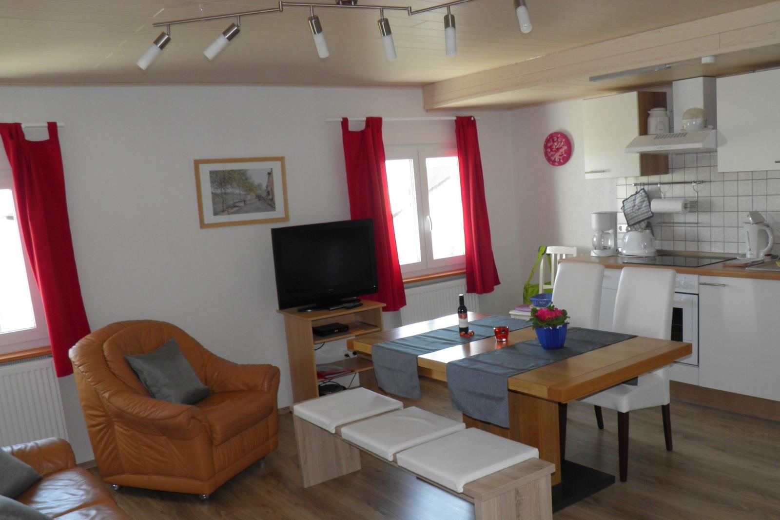Dort steht Ihnen eine bequeme Couch, ein Esstisch mit vier Stühlen und ein großer Flachbildfernseher (43 Zoll Sat-TV) zur Verfügung.